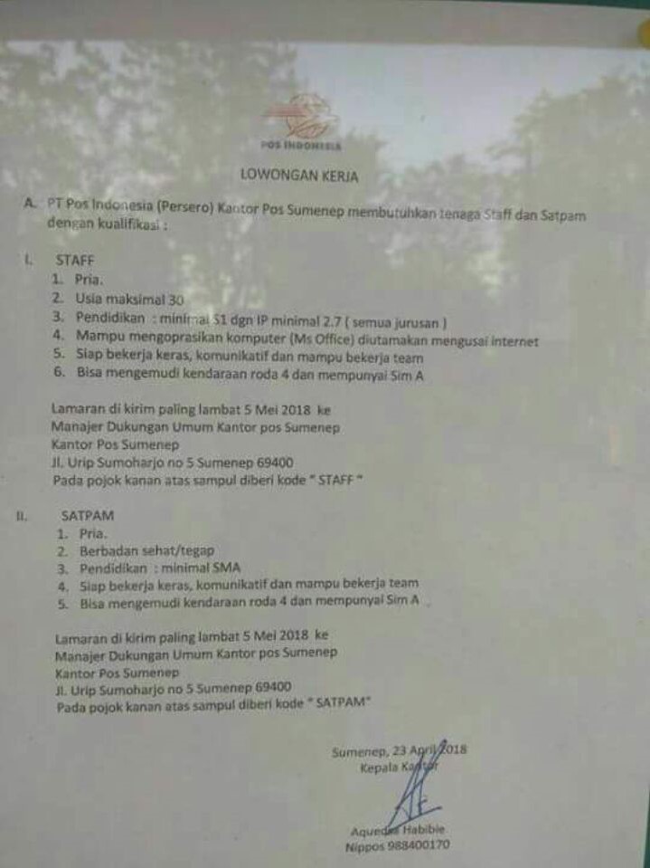 PT. Pos Indonesia (Persero) Kantor Pos Sumenep membutuhkan tenaga Staff dan Satpam dengan kualifikasi :