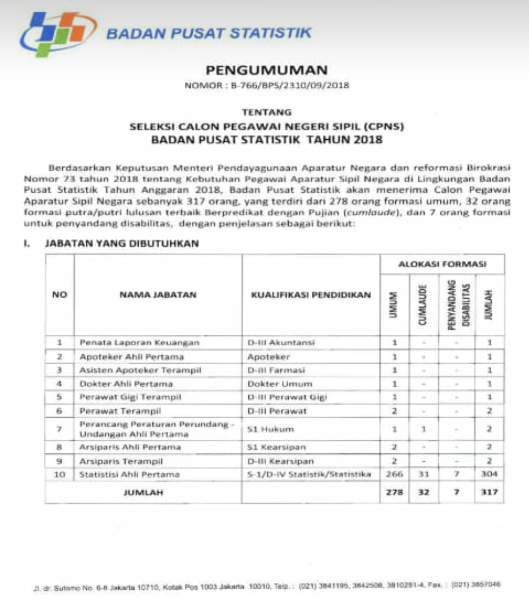 Berdasarkan Keputusan Menteri Pendayagunaan Aparatur Negara dan reformasi Birokrasi Nomor 73 tahun 2018, Badan Pusat Statistik akan menerima CPNS sebanyak 317 orang, yang terdiri dari 278 orang formasi umum, 32 orang formasi putra/putri lulusan terbaik berpredikat cumlaude, dan 7 orang formasi untuk penyandang disabilitas, dengan penjelasan sebagai berikut :