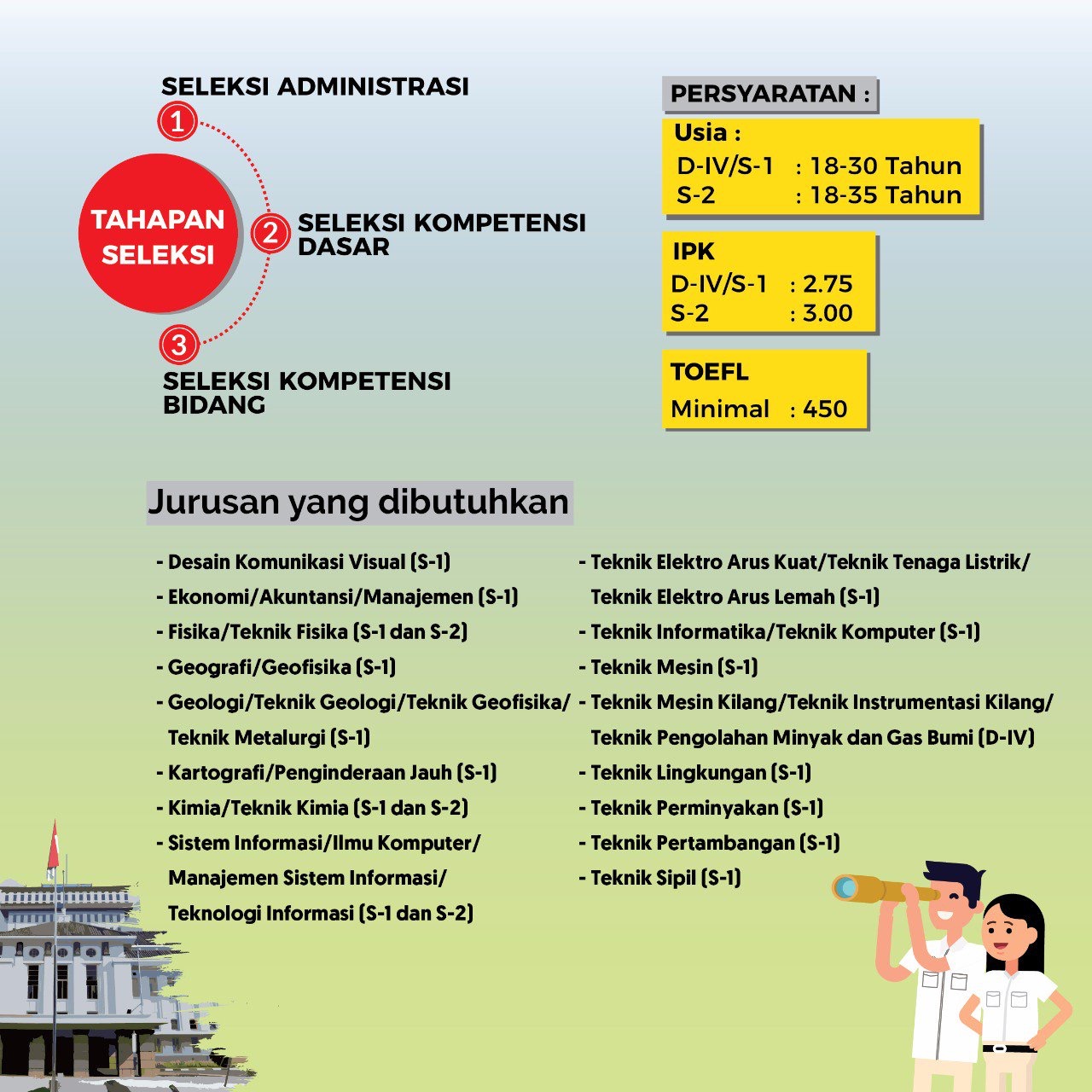 REKRUTMEN CPNS KEMENTERIAN ESDM TAHUN 2018 Posted on September 20, 2018 By cdc-uim Ekonomi/Akuntansi, Info Lowongan Kerja, Media/Periklanan, Perbankan/Finansial, Pertanian/Perikanan/agrikultur, Teknologi Informatika Formasi dibutuhkan : 65 Formasi Info Pendaftaran : 26 September- 10 OktoberJurusan yang dibutuhkan terlampir